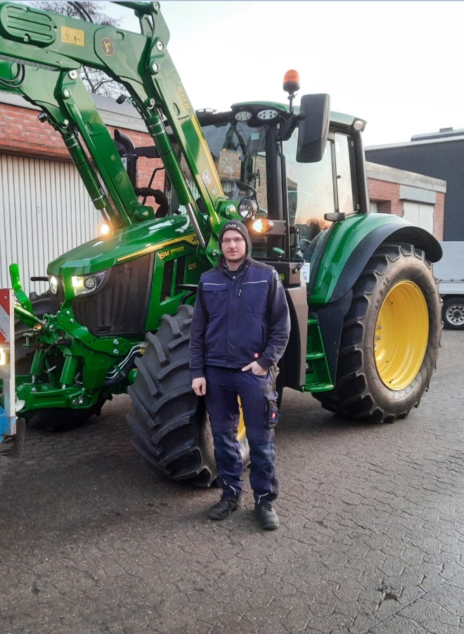 Der verantwortliche Schlepperfahrer Fabian Lühmann freut sich über sein neues Arbeitsgerät. Mit großer Begeisterung nimmt er den modernen Schlepper in Empfang, der ihm die tägliche Arbeit deutlich erleichtern wird. Leistungsstark, zuverlässig und komfortabel ausgestattet.